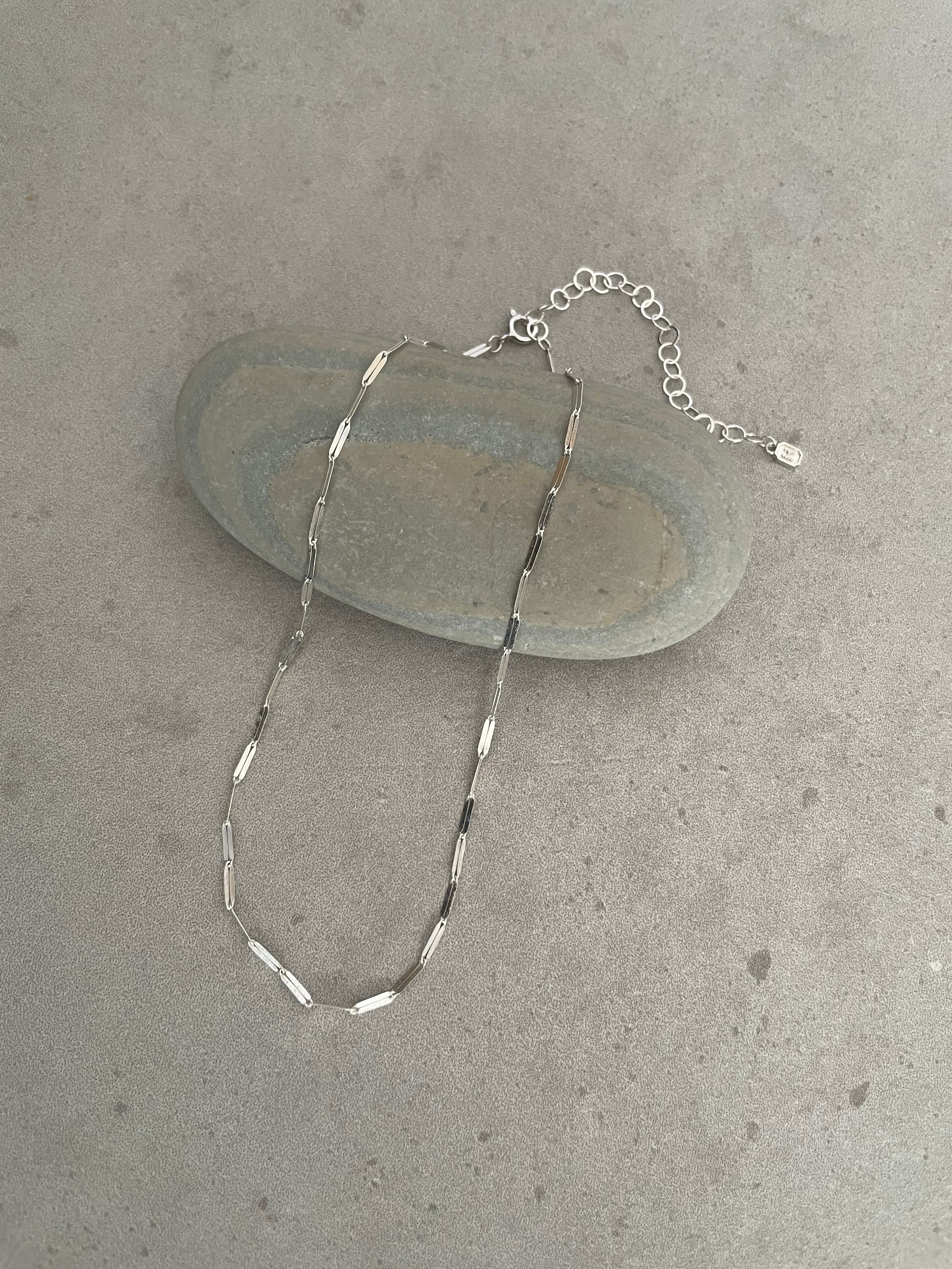 A silver chain choker that drapes lightly against the skin, catching the light with subtle elegance.